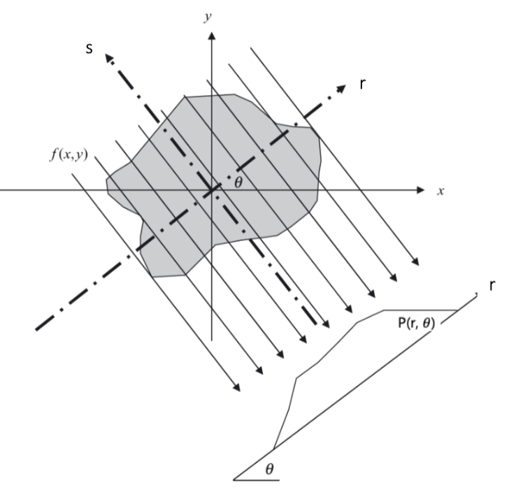 Radon thranform is: \(P(p, \theta) = R{f(x,y)} = \int_Lf(x,y)dl = \int_{-\infty}^{\infty}f(pcos\theta-qsin\theta, psin\theta+qcos\theta)dq\)